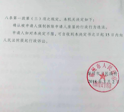 2018年3月2日,在创为律师的维权方向下,朱女士拿到了市政府的复议结果,认定被申请人制拆除中请人房屋的行政行为违法。