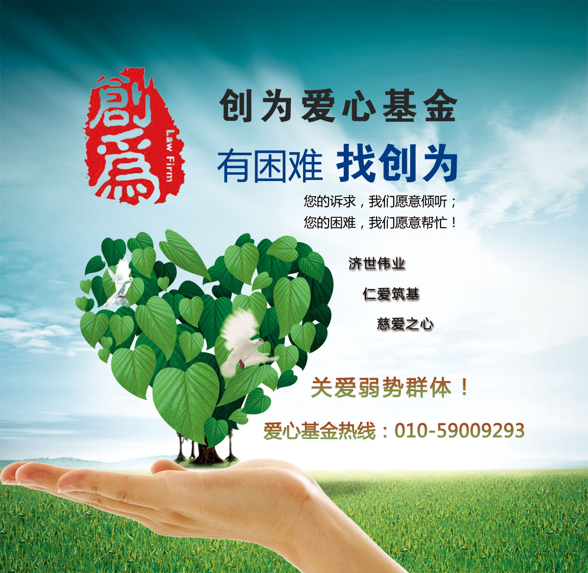 2014年10月22日,北京创为律师事务所正式成立“创为爱心基金”,此基金的愿景是“尽我所能,做好公益”,以爱心为理念,专款专用的一支基金。主要用于关爱弱势群体,灾害救助,儿童关怀。“创为爱心基金”将采取公开、透明的管理平台。