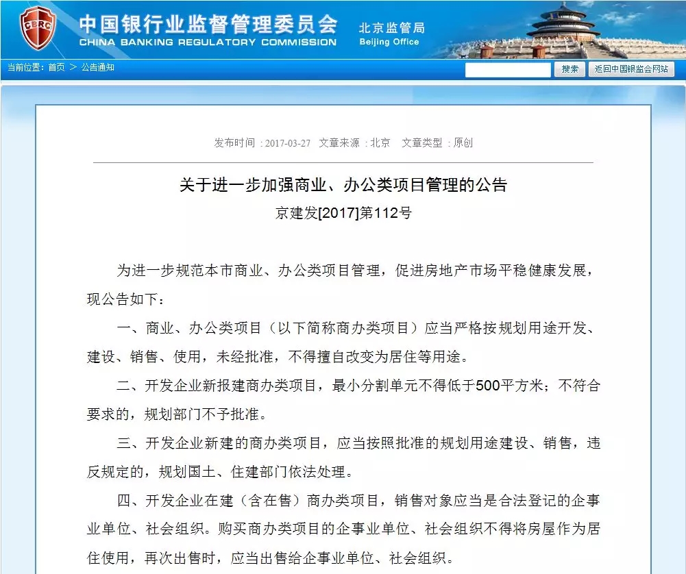 2017年3月26日,在北京发布住宅“3.17认房又认贷”的背景下,商住市场迎来极大机会,北京商住创出同期历史新高,不限购的商住项目量价齐升。但是,政策突变,为了进一步打击投机炒房行为,规范商业、办公类项目管理,促进房地产市场平稳健康发展,北京发布了《关于进一步加强商业、办公类项目管理的公告》(俗称3.26新政)。